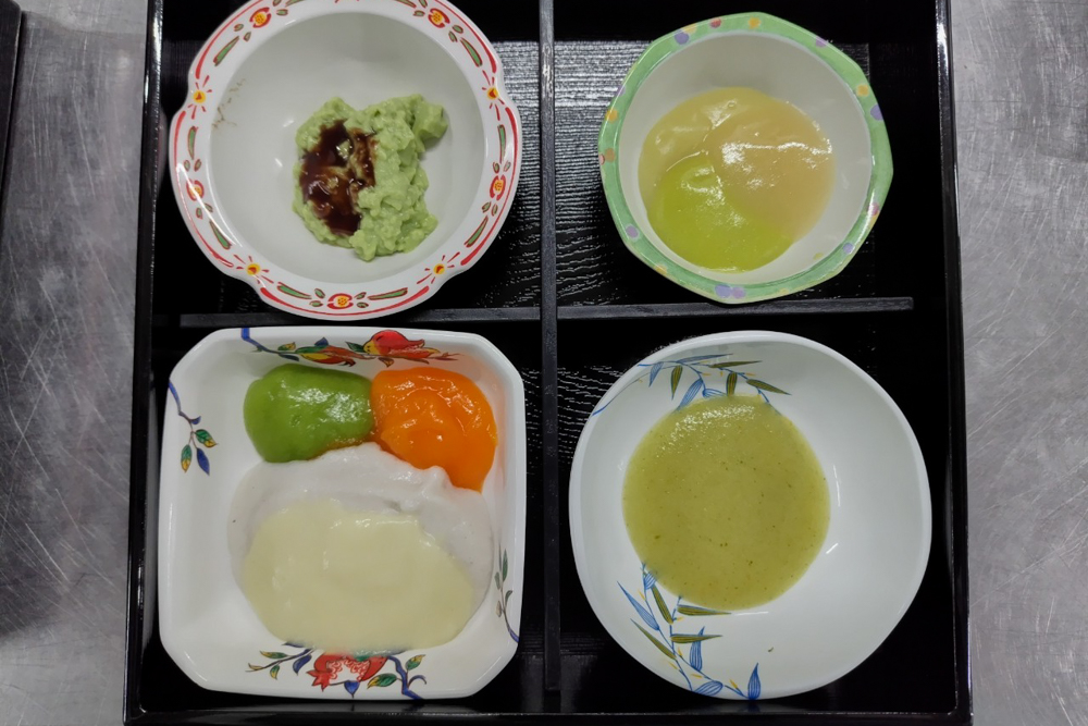 こちらの写真は、「ミキサー食」と呼ばれる嚥下調整食になります。ほぼ噛まずに飲み込めるため、さきほどの超刻み食が難しいケースなどに向いている食形態です。 |