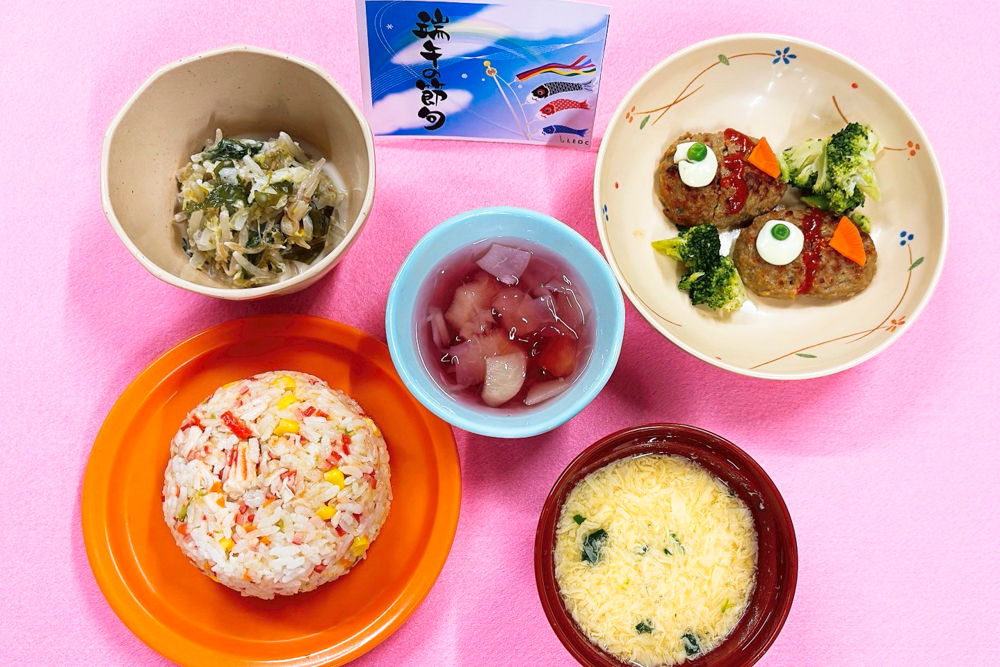かに風味炒飯は彩り豊かな具材を使用し、食欲をそそる見た目と味わいに仕上げました。かきたま汁はふんわりとした卵が特徴で、体にやさしい味わいです。ハンバーグは特別な盛り付けで、こどもの日らしさを演出しました。