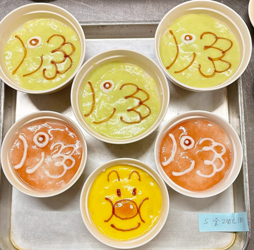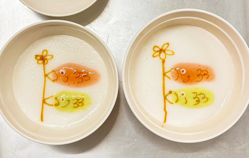 飲み込む力が弱い方向けに、お粥をゼラチンで固めました。口の中でまとまりやすく、喉越しがスムーズになるよう調整しています。色とりどりのゼラチン粥で、黄色や緑、オレンジなど、鮮やかなこいのぼりを表現しました。