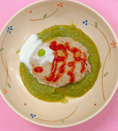 噛んだり飲み込んだりする力が大きく低下した方向けに、食材をなめらかにミキサーにかけた「ミキサー食」をご用意しました。口の中で形が崩れやすく、飲み込みやすいのが特徴です。緑色のソースと赤色のケチャップで、こいのぼりをイメージしたデザインに仕上げています。