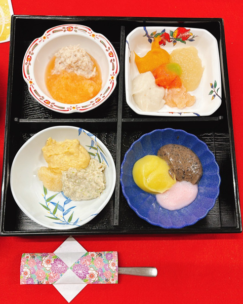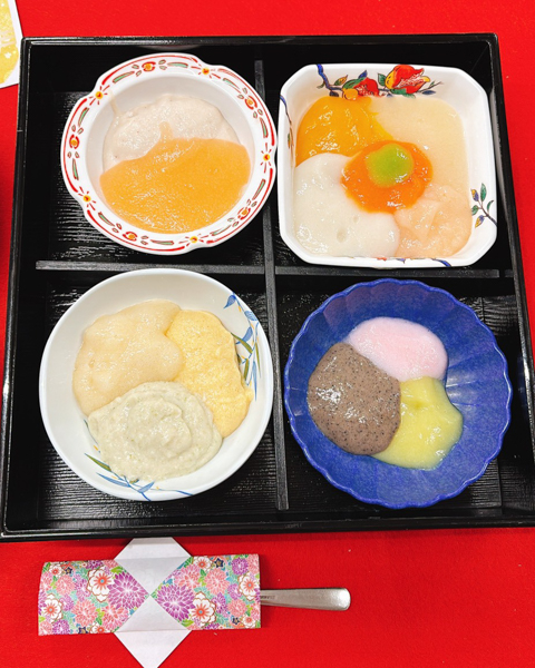 飲み込む能力が低下しておられる方にも、お正月の行事食を楽しんでいただこうと工夫を凝らして提供いたしました。