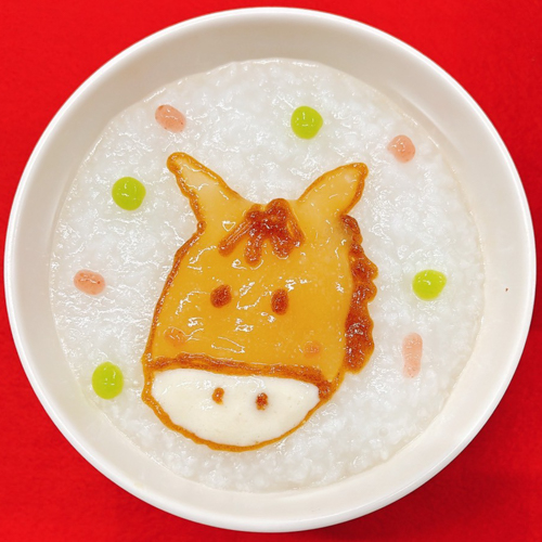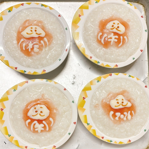 お粥は工夫を凝らして「飾り粥」で提供いたしました。今年の干支である午(うま)や、だるま、獅子舞いなど、お正月にちなんだ飾り付けを一つひとつ心を込めて手作りしました。