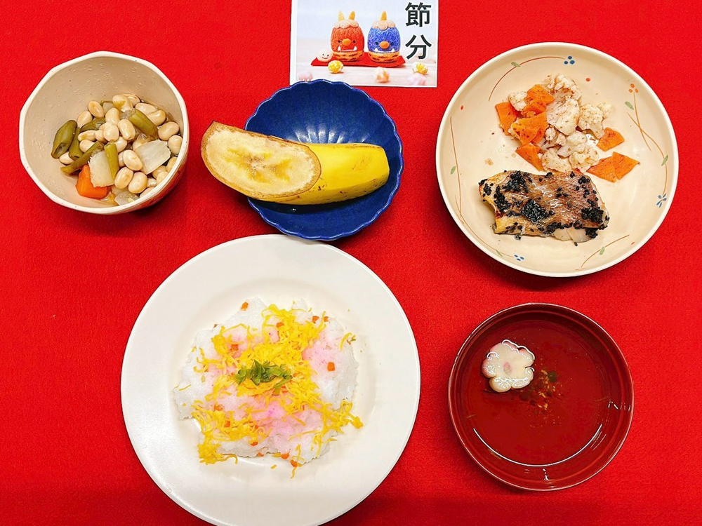 今年一年の皆さまの「ご健康」と「ご多幸」の願いを込めて提供いたしました、当苑の行事食「節分」をご紹介いたします。